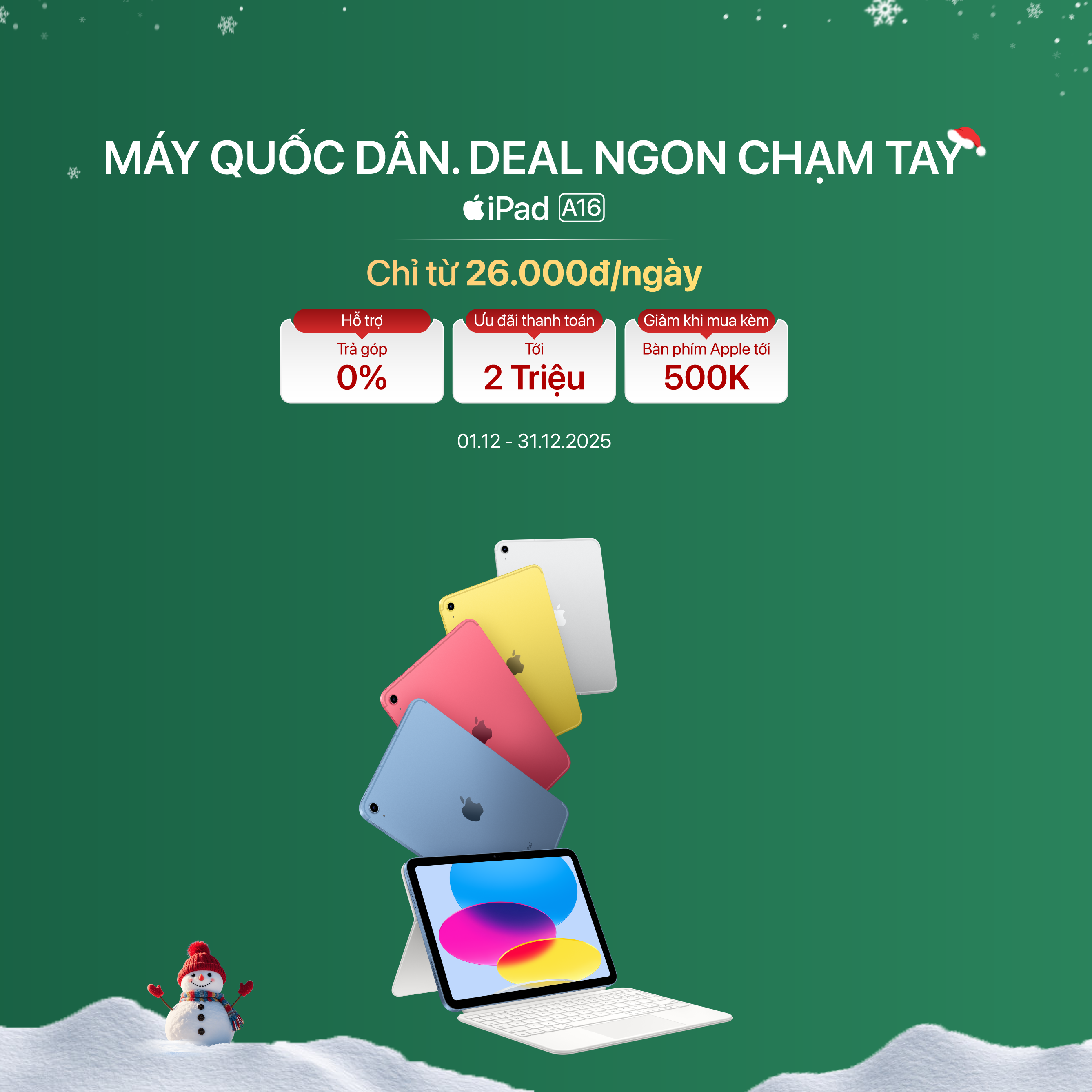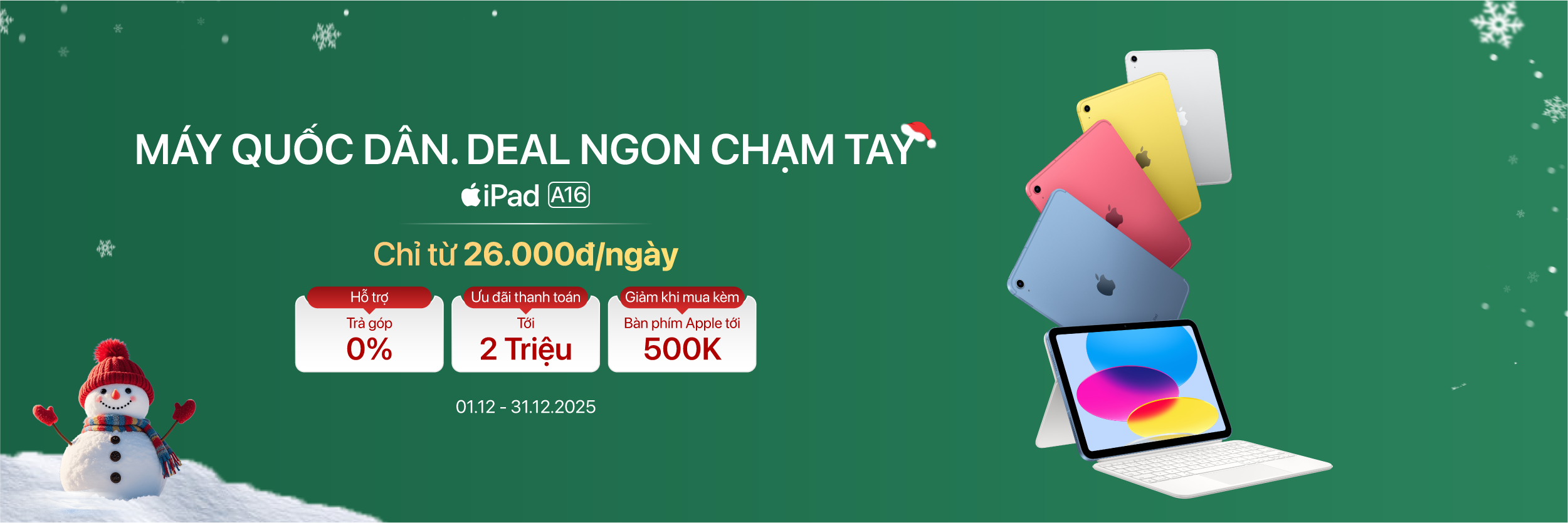 • iPad A16 (iPad Gen 11):  dòng iPad mới của Apple được ra mắt trong Tháng 4/2025. iPad A16 với 11 inches màn hình hiển thị chất lượng cao, sử dụng chip A16 siêu mạnh mẽ và dung lượng lưu trữ khởi điểm từ 128GB. iPad hỗ trợ hoàn thành công việc và giải trí mọi nơi, chạy mượt mà mọi tác vụ.