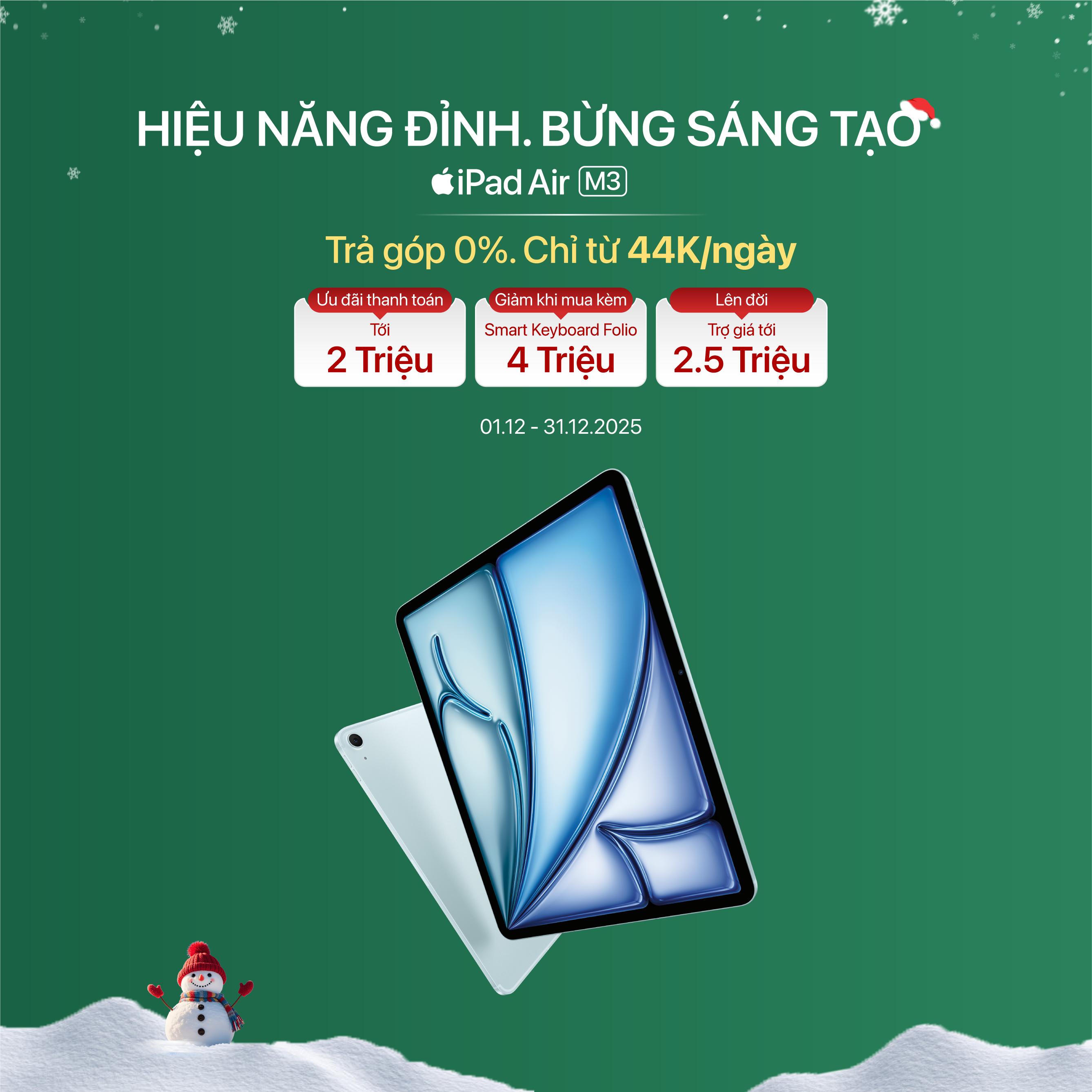 • iPad Air M3: Sở hữu chip M3 mạnh mẽ, hiệu suất tăng đáng kể so với M2. Màn hình Liquid Retina 13 inch hoặc 11 inch, hỗ trợ Apple Pencil Pro và Magic Keyboard thế hệ mới. Lý tưởng cho sinh viên, dân sáng tạo nội dung hoặc người làm việc linh hoạt cần thiết bị vừa mạnh, vừa gọn nhẹ.